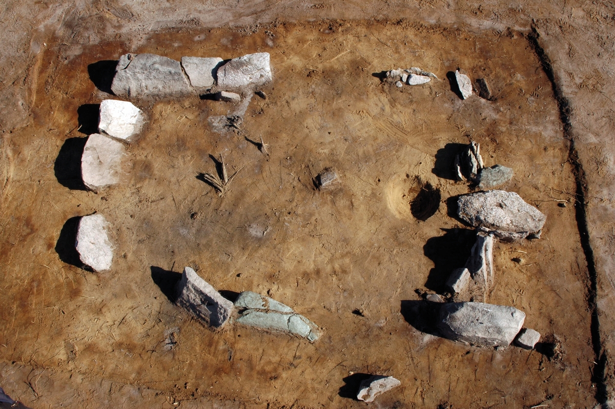 En ofylld, rektangulär stensättning, A 2512 fotograferad i samband med en arkeologisk undersökning av gravfältet RAÄ Barnarp 29:1, L1974:2724 på Torsvik i Jönköping. I högra bildkanten syns en sydport med takhäll, se även JMF.00328:10.