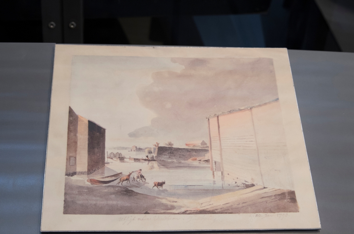 Stadshistoriska utställningen i arkivhuset. Utsigt nära Vindbron i Jönköping. 20 Januari 1790. Reproduktion av akvarell av Jonas Carl Linnerhielm.