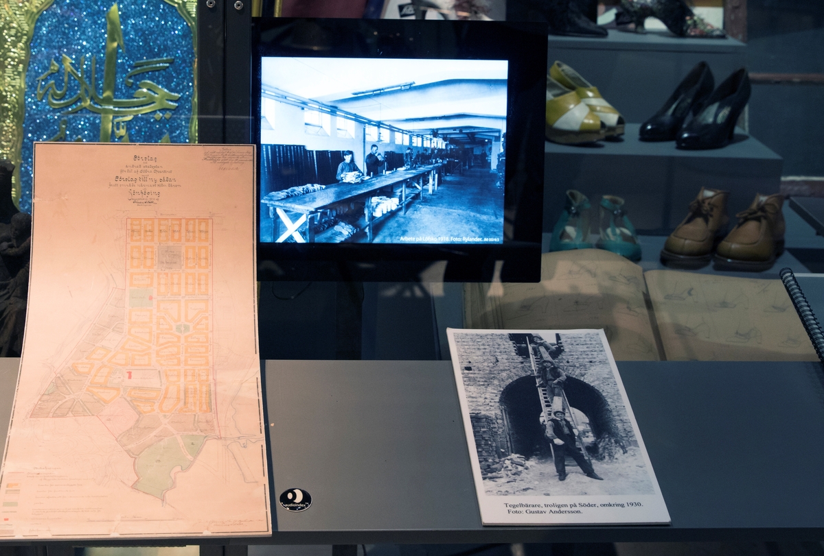 Stadshistoriska utställningen i arkivhuset. Reproduktion av förslag till ändrad stadsplan för del av Södra kvarteret. Upprättad 1910 av stadsingenjör Einar Adell. Planen fastställd 1912. Bild av tagelbärare, troligen på Söder, omkring 1930. Foto av Gustav Andersson.