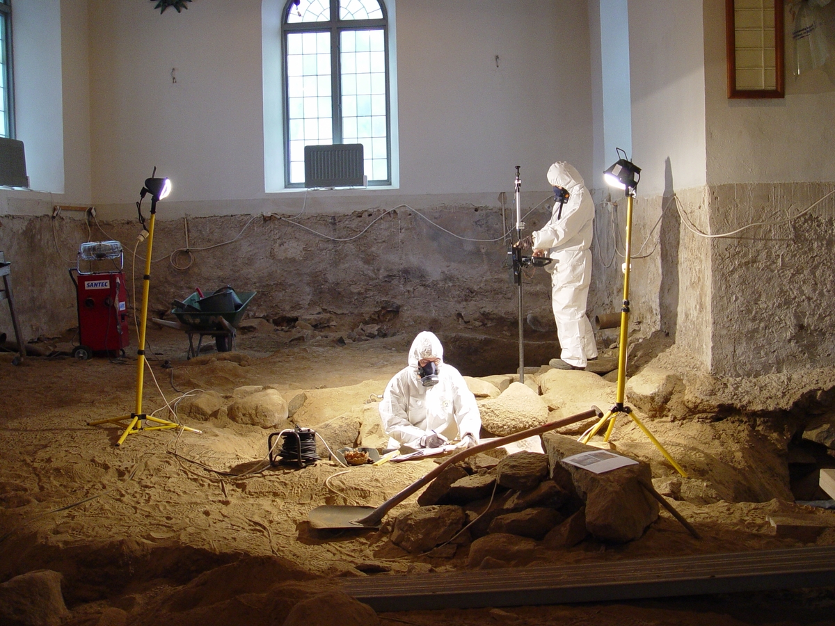Interiör från Barnarps kyrka i Jönköpings kommun. Inför planerad ny golvläggning i samband med fukt- och mögelsanering genomfördes en arkeologisk undersökning i kyrkan under år 2006. På grund av den ohälsosamma arbetsmiljön bär arkeologerna på bilden skyddskläder.