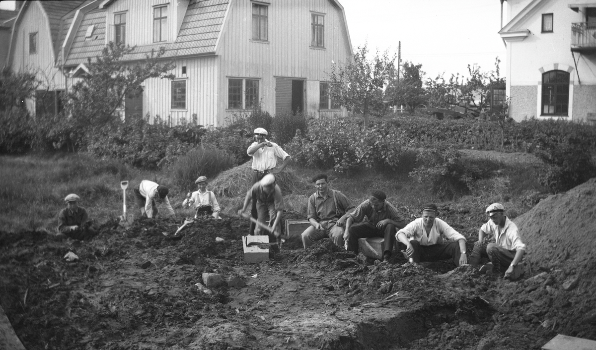 Ett gäng pojkar och män letar efter fynd i uppgrävda massor från vallgravarna vid Rumlaborg i Huskvarna 1932. Vallgravarna hade grävts ur vintern 1931 och sommaren 1932 grävdes ytterligare i den innersta vallgraven. Massorna kördes i skottkärror till en plats vid sidan av borgen där de gicks igenom. Stående är fil. stud Anders Lindahl och strax till höger om honom, tittandes in i kameran är fil. stud. Walter Fredriksson.