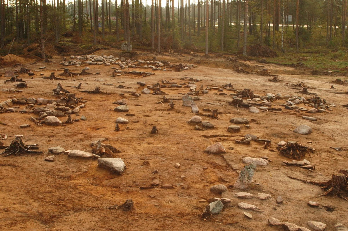 Vy från en arkeologisk undersökning av gravfältet RAÄ Barnarp 29:1, L1974:2724. Centralt i bilden finns anläggningen A10484, som benämndes som en hussättning, den bestod av sex par större stenar formerade som de bärande stolparna i ett långhus. Centralt i anläggningen låg en brandgrop som också kan symbolisera härden i huset. Under tre av stenarna påträffades också brandgravar.