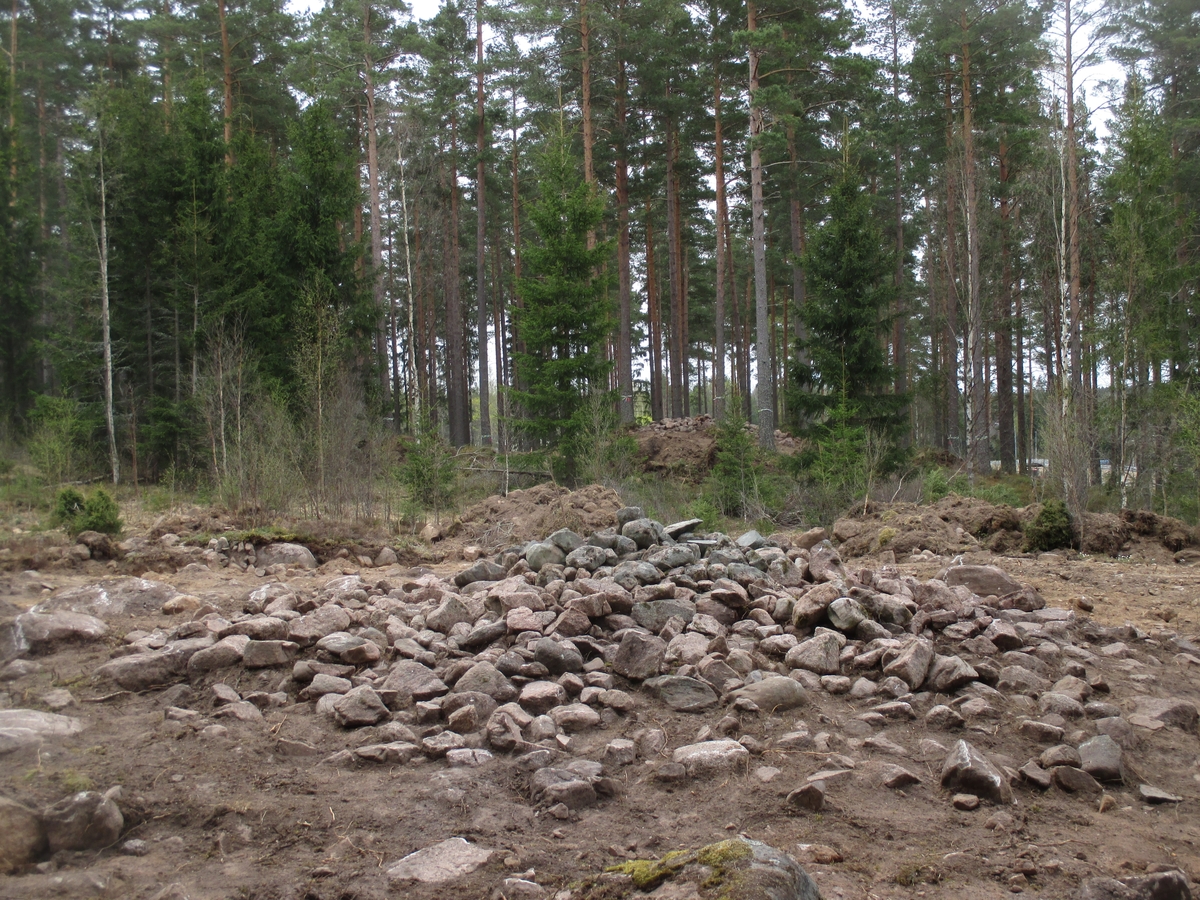 En förhistorisk grav, stensättning, efter framrensning. I bakgrunden syns ytterligare en framrensad stensättning.