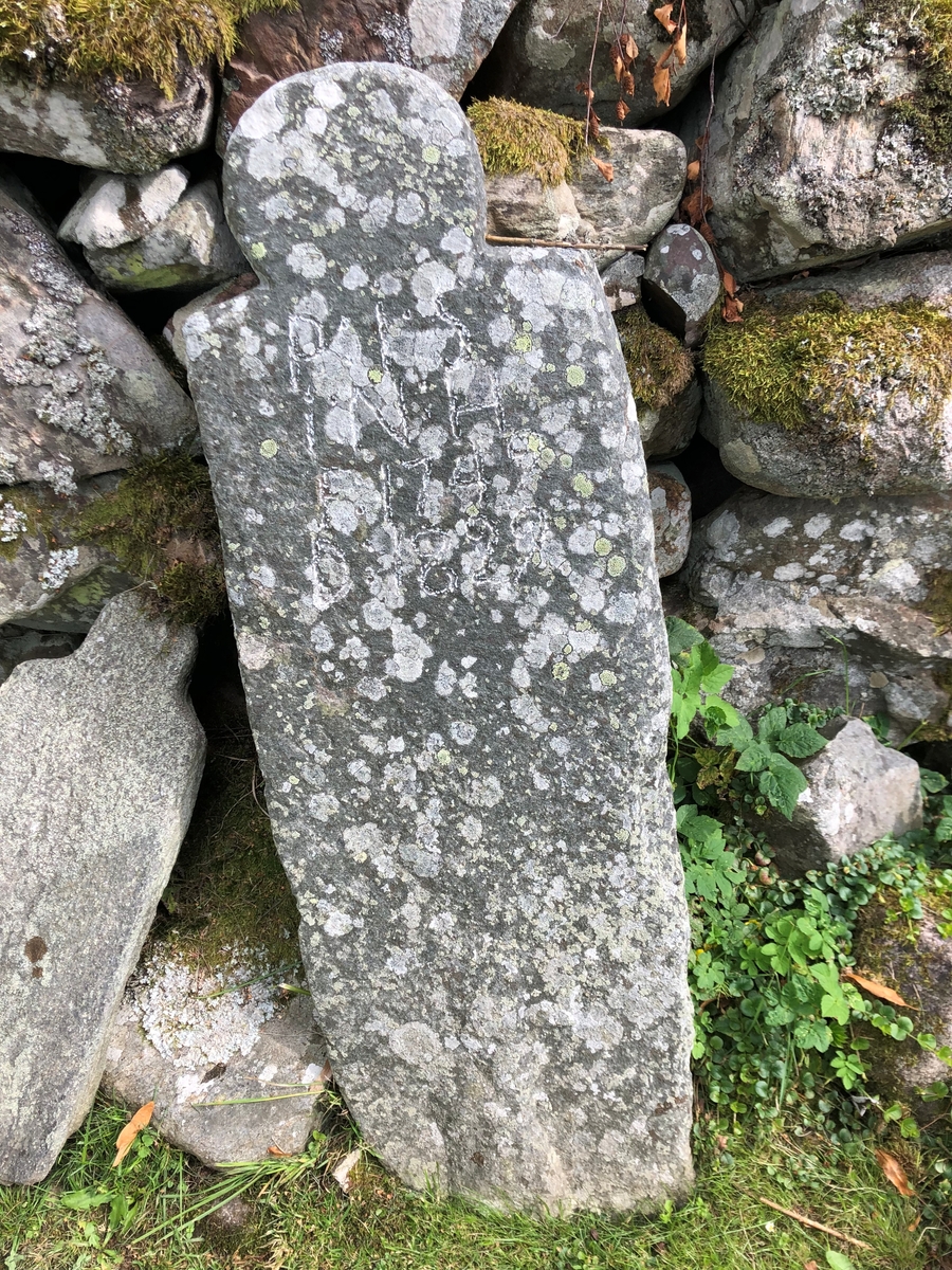 Handhuggna gravvårdar, kyrkogårdsmuren Vallsjö gamla kyrkogård.