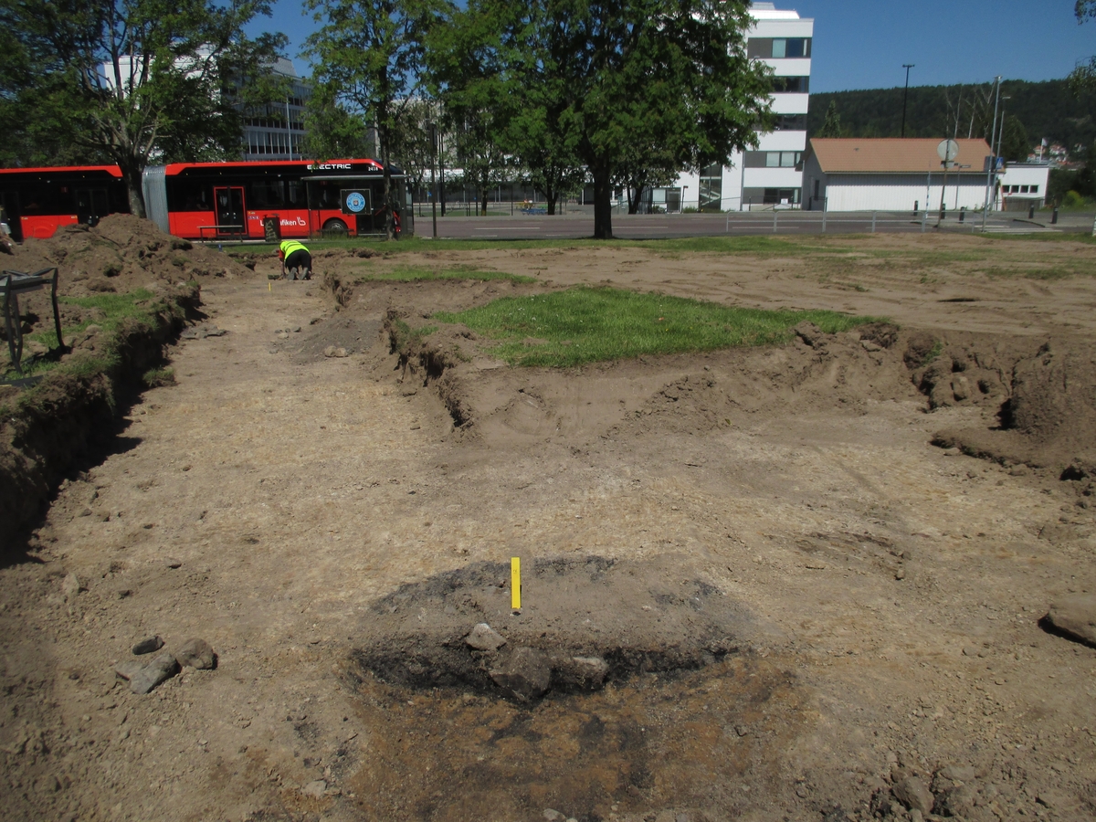 I förgrunden en av de tiotal härdar som undersöktes vid Sandagymnasiet i Huskvarna. I bakrunden ses den Engelska skolan.