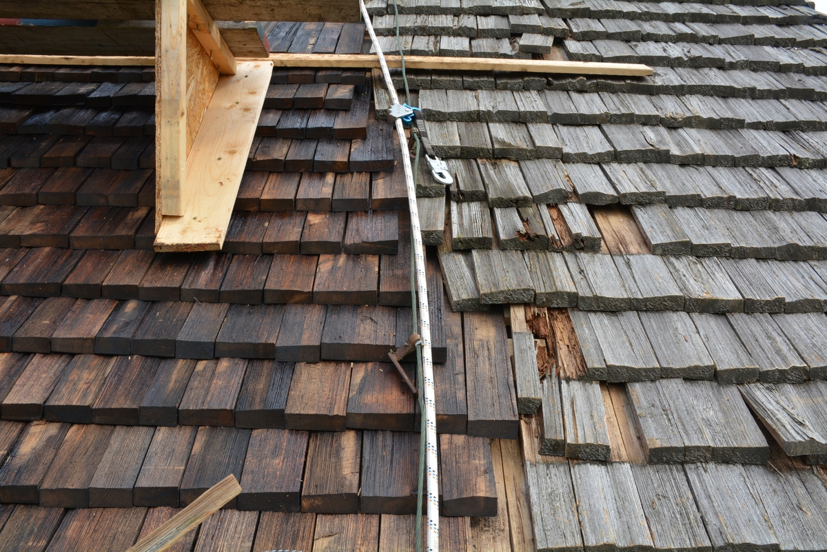 Norra Unnaryds kyrka. Norra Unnaryds socken i Jönköpings kommun. Detalj pågående omläggning av spåntak.
