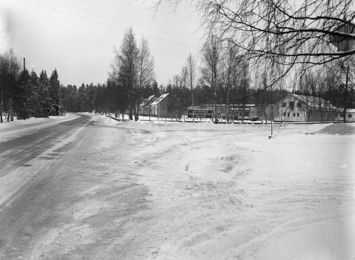 I en vägkorsning i Mullsjö står en skylt med texten AB Svenska Charmeuseväveriet Mullsjö.
