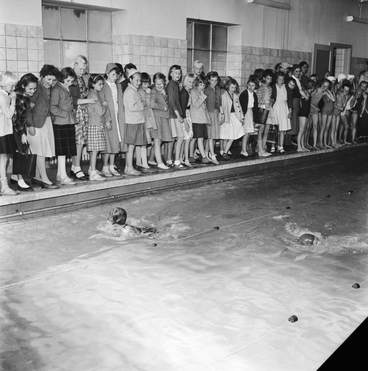 Anordnad simtävling, skolsim, på badhuset i Huskvarna år 1956.