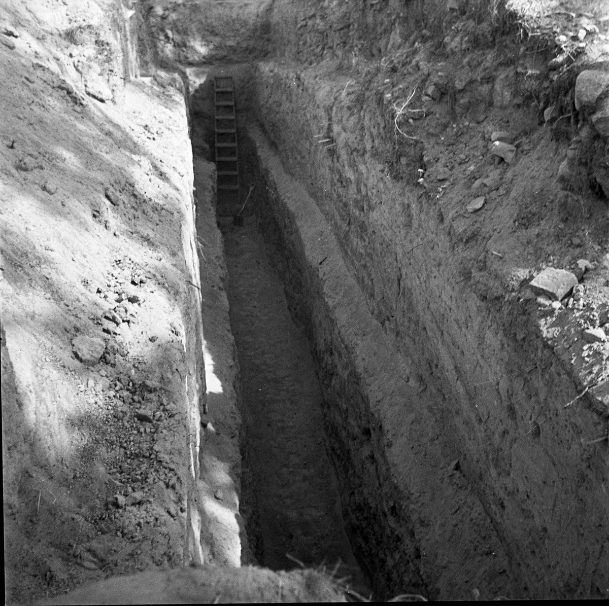 Utgrävningen av schakt C genom södra delen av borgkullen vid Rumlaborg i Huskvarna är helt avslutad. Fotot är taget i samband med arkeologiska undersökningar vid borgen sommaren 1937. För att förhindra ras grävdes schaktet i tre terasseringar som vardera var upp till 1,5 meter djupa. Som bredast på toppen var schaktet tre meter brett.