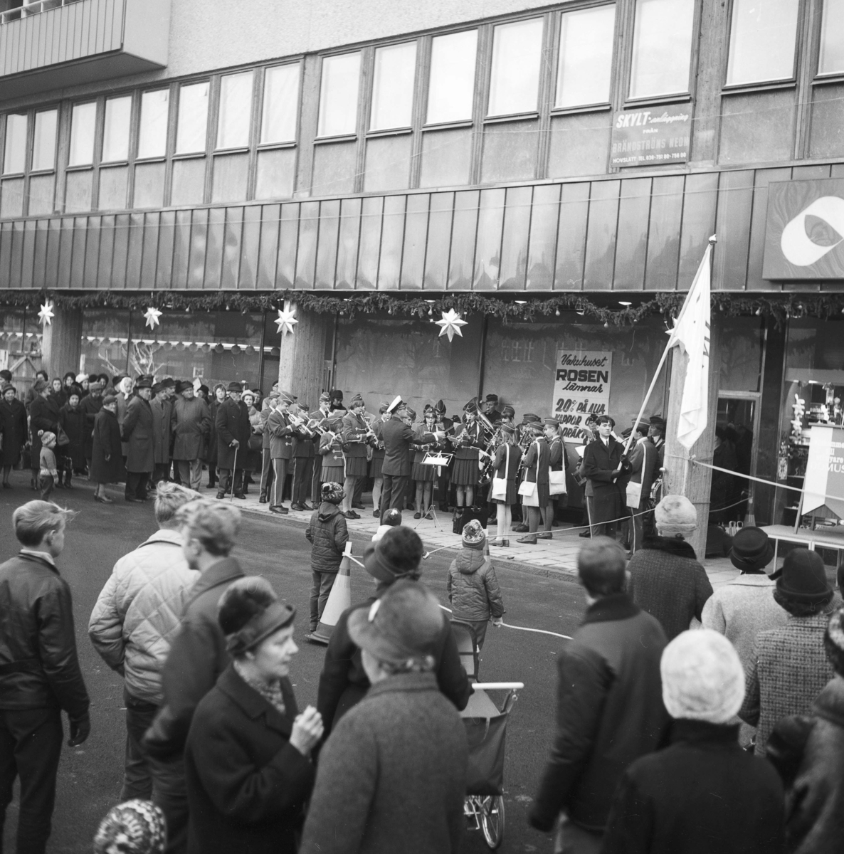 En ungmusikkår underhåller vid invigningen av det nya Domus varuhuset på Kungsgatan i Huskvarna år 1966, nuvarande Rosengallerian.