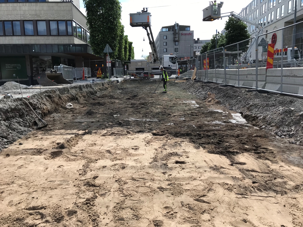 Metalldetektering av medeltida kulturlager pågår. Foto taget vid en schaktningsövervakning i samband med grävningsarbete på Västra Storgatan i Jönköpings stad och kommun.