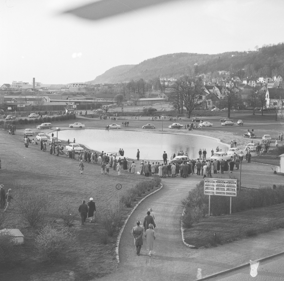 Bilparad i Mjölkafållan i Huskvarna. Det är valtider och på plakatet kräver Kommunisterna "Lagfäst pension, Mindre åt generalerna, Rättvis beskattning".