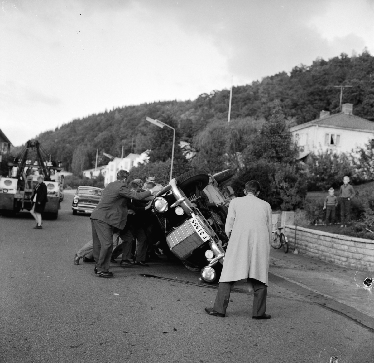 En grupp människor har samlats kring en bil som har vält på Gripenbergsgatan i Huskvarna.