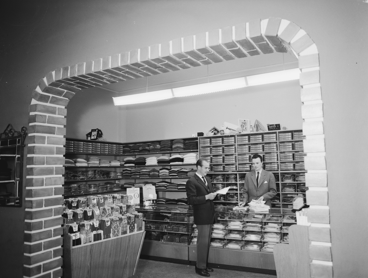 Interiör från Holmers herrekipering i Huskvarna den 28 augusti 1958. På bilden står Direktör Holmer och biträde Rune Ekström.