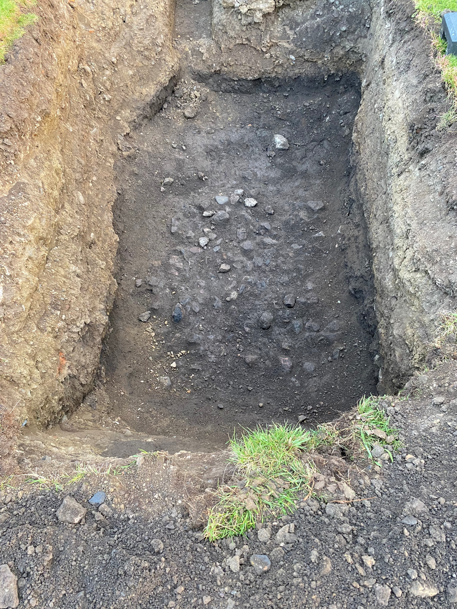 En stenpackning som framkommit i botten av ett schakt strax söder om den södra längan på Visingsborgs slottsruin på Visingsö, Jönköpings kommun och län.