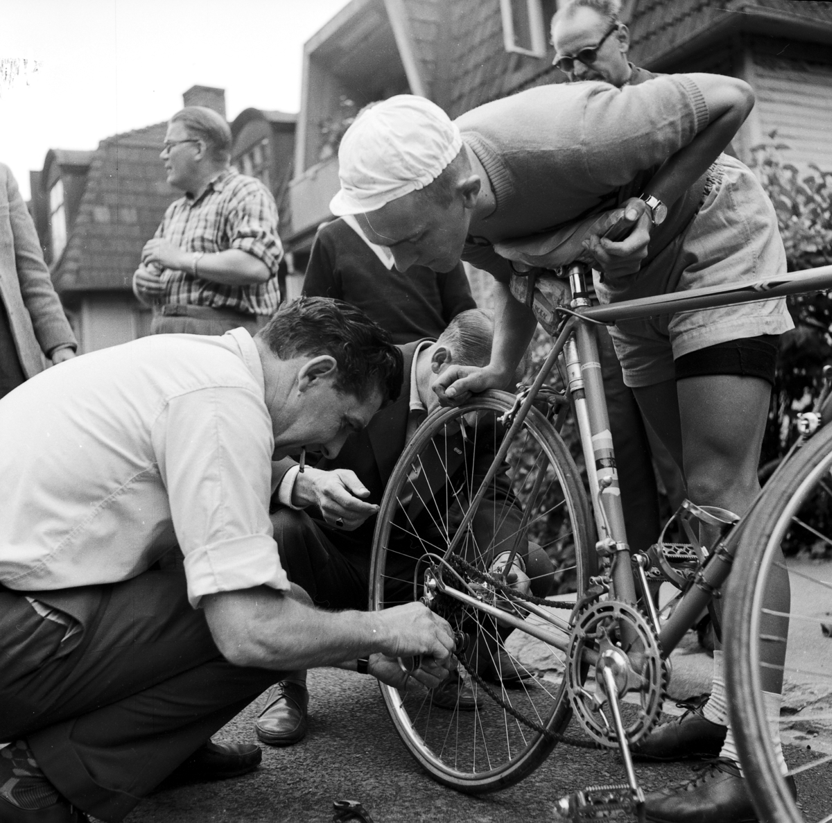 VM cyklister i Huskvarna. En deltagare får hjälp med sin cykel.