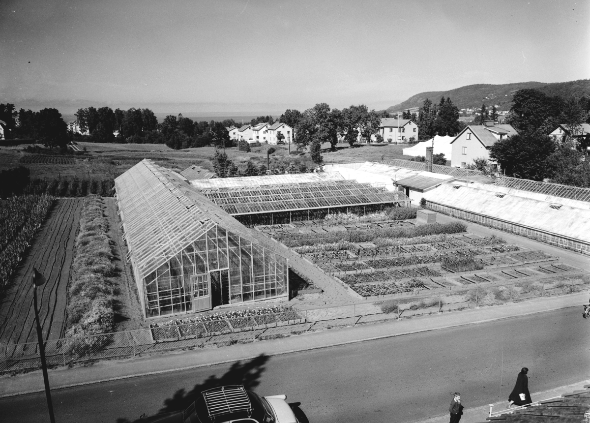 Dimbergs handelsträdgård på Gråbogatan och Wilhelm Thams väg och i bakgrunden ser man utsikten över Huskvarna.