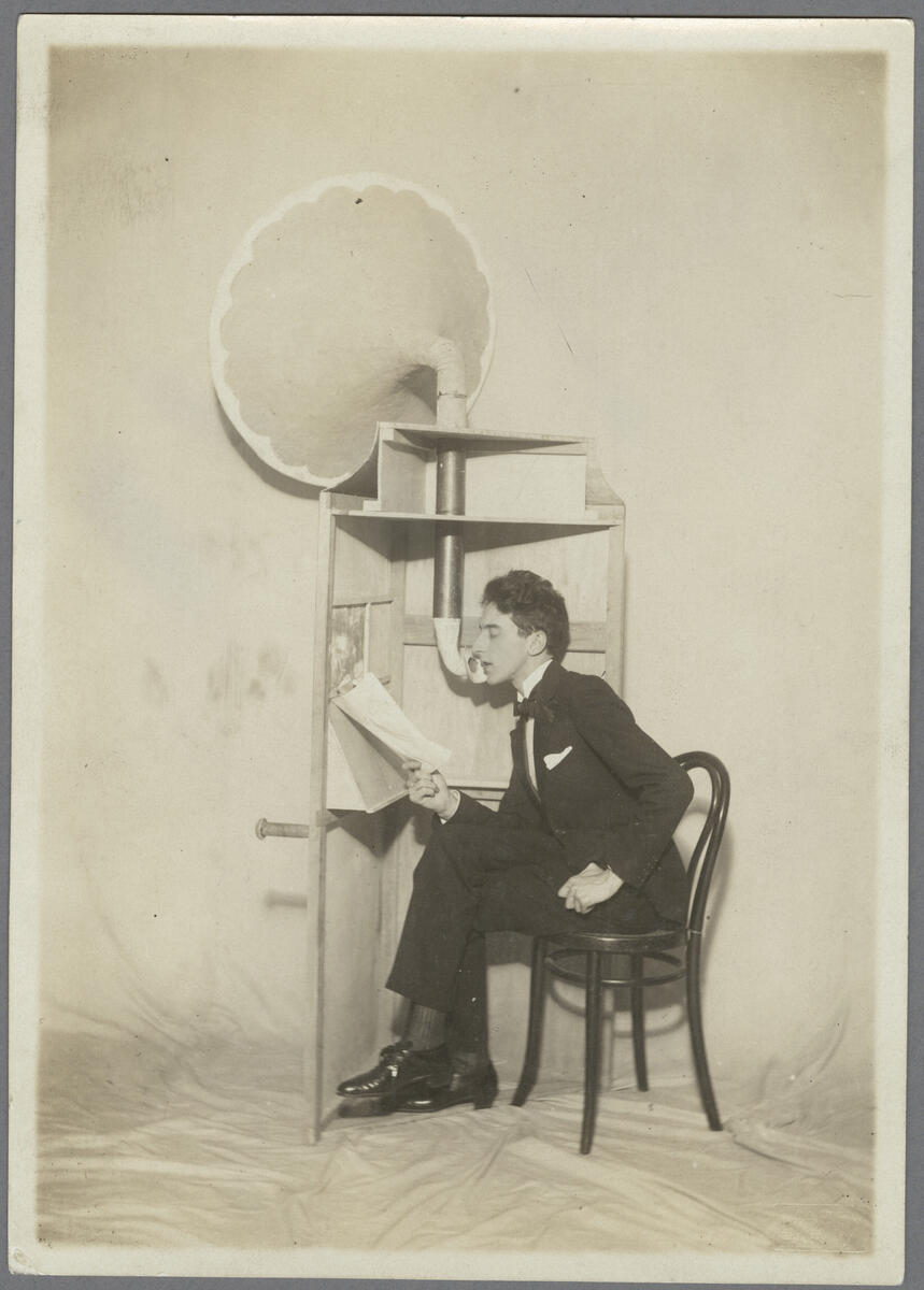 Jean Cocteau vid en av fonograferna från uppsättningen "Bröllopet på Eiffeltornet".