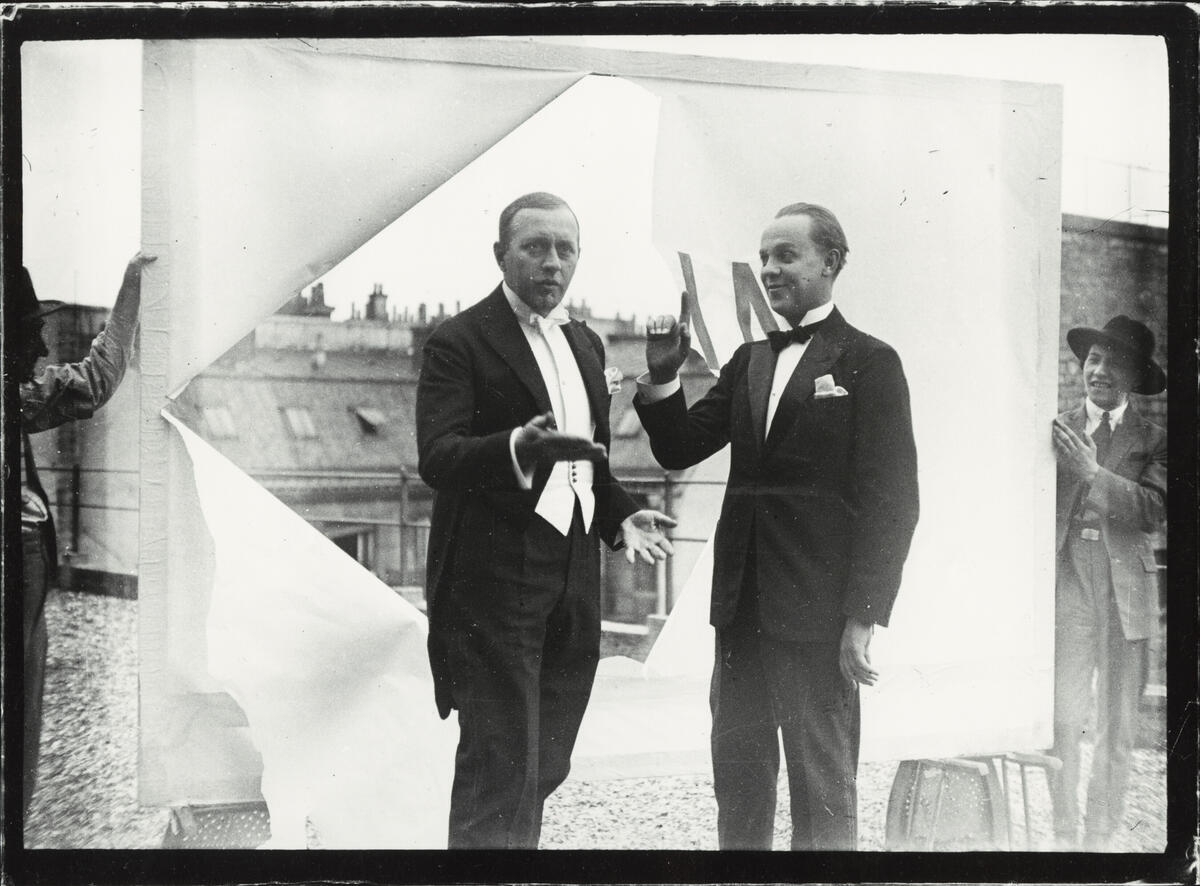Rolf de Maré, Jean Börlin och två oidentifierade personer under inspelningen av filmen "Entr'acte" (1924).