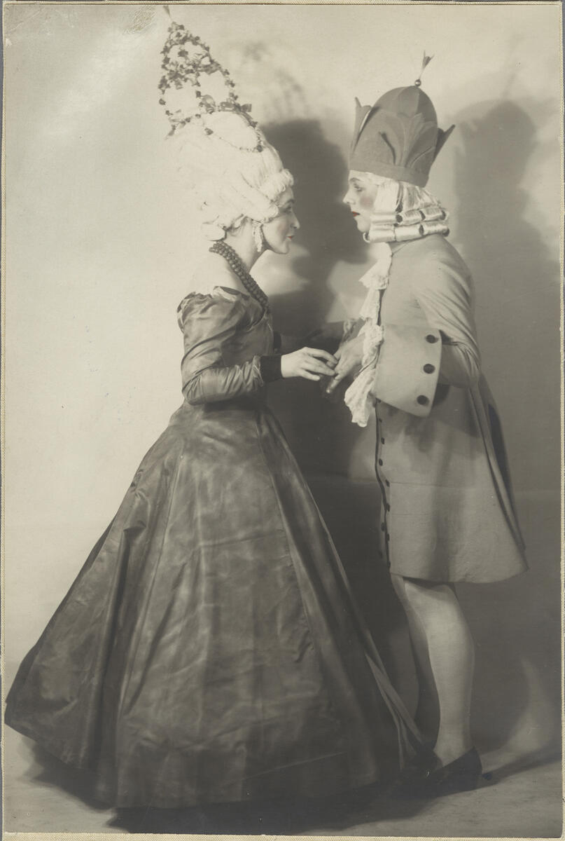 Kolorerat rollporträtt av Jenny Hasselquist och Jean Börlin i uppsättningen "De fåvitska jungfrurna".