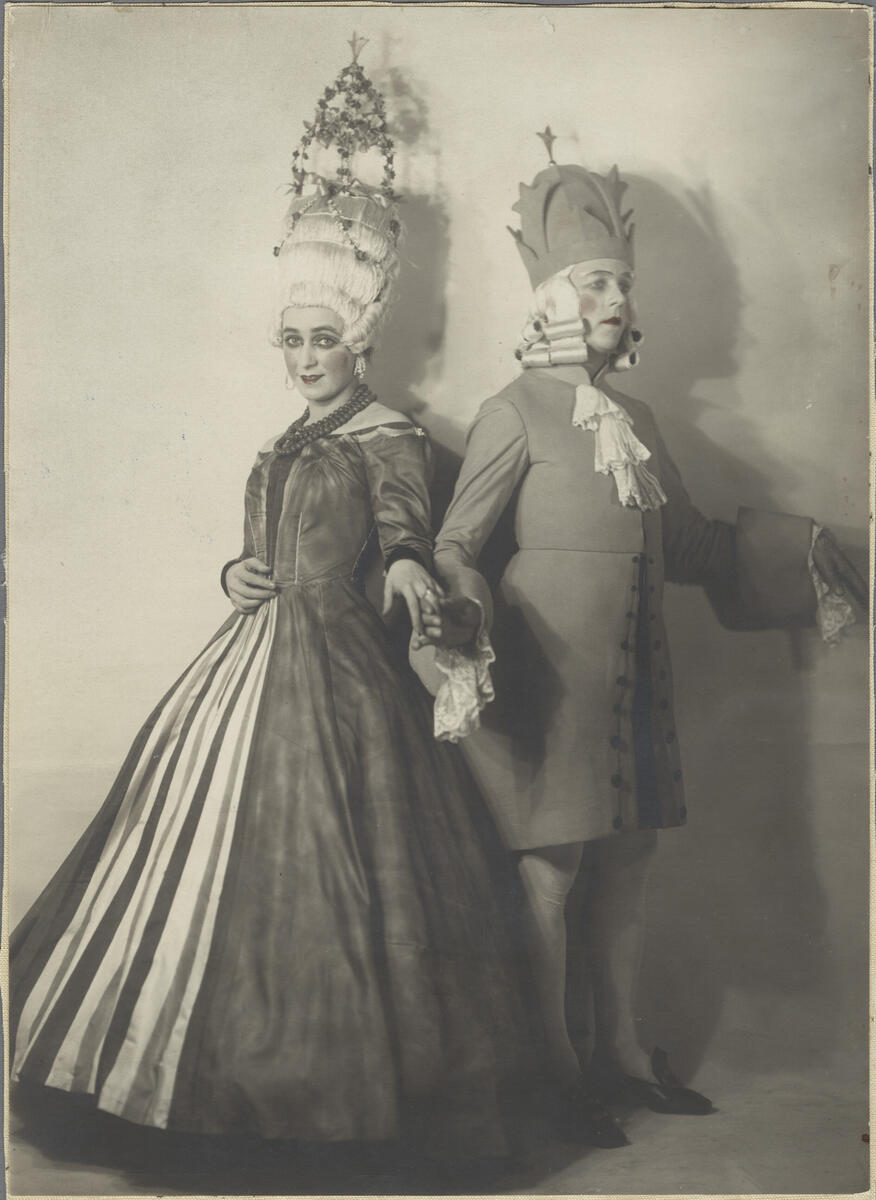 Kolorerat rollporträtt av Jenny Hasselquist och Jean Börlin i uppsättningen "De fåvitska jungfrurna".