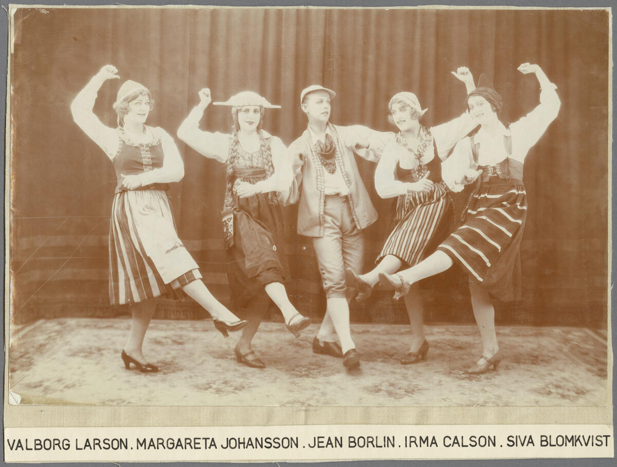 Rollporträtt av Valborg Larsson, Margareta Johanson, Jean Börlin, Irma Calson och Siva Blomkvist i dansnumret "Svenska danser".