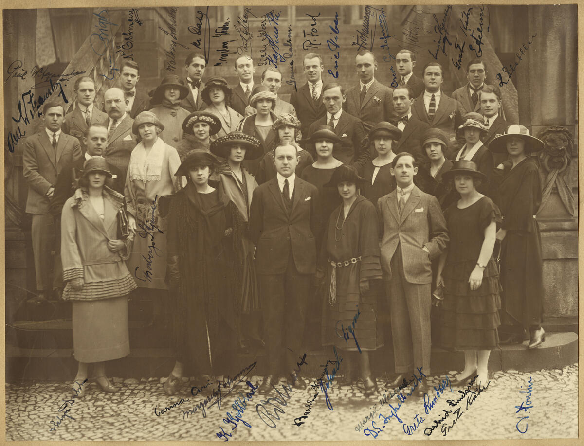 Svenska Balettens dansare och övrig personal i Berlin. Flera medlemmar ur ensemblen har signerat fotografiet.