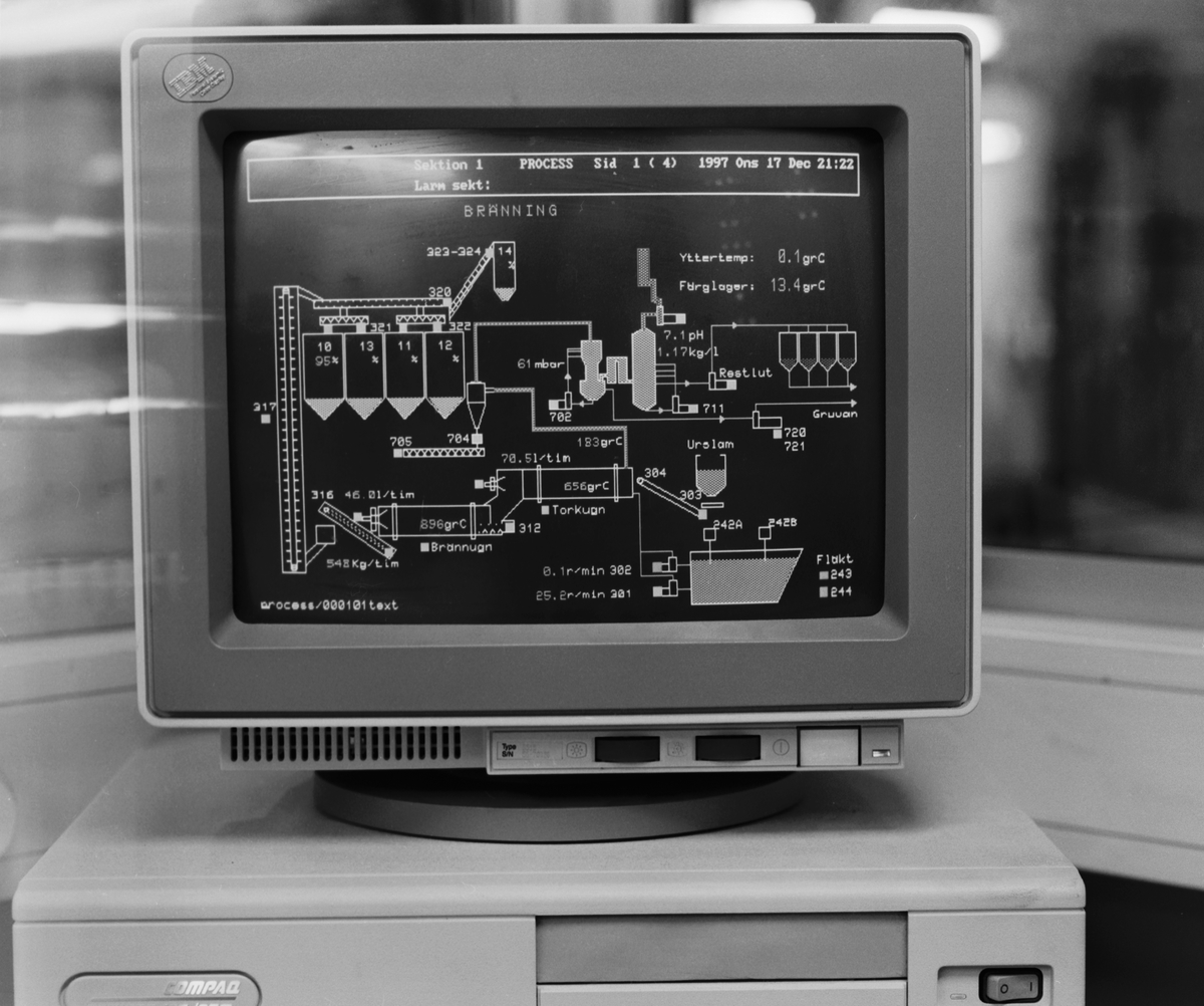 Datorskärm som visar flödeschema från processen, information från bränningen. Processystemet kommer från Boliden, BIS-system. Systemet var tidigare installerat i anrikningsverket flyttade till Falu Rödfärg efter stängningen av gruvan.