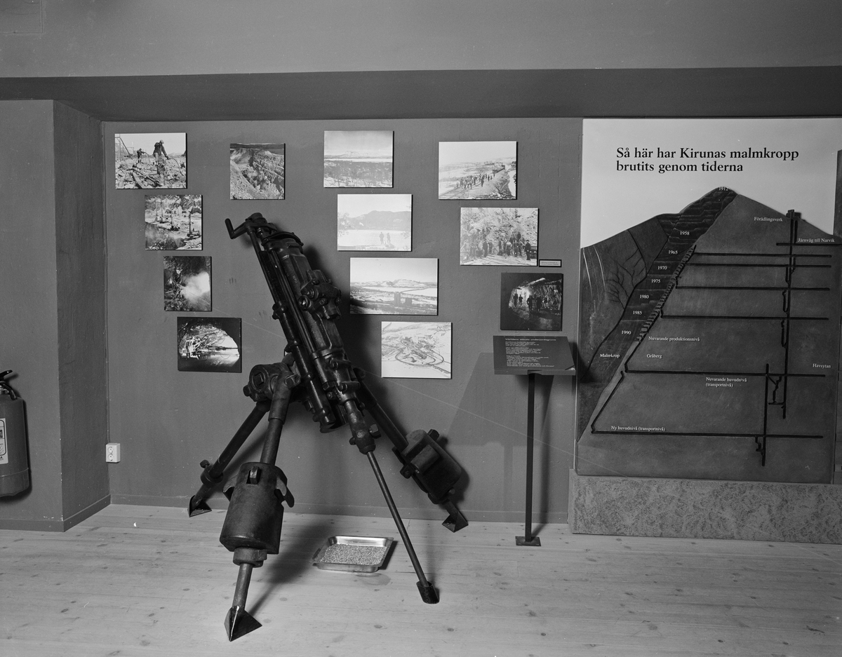 Dokumentation av Gruvutställningen. Sjätte rummet: Bergborrmaskin och bildillustrationer från andra gruvor.