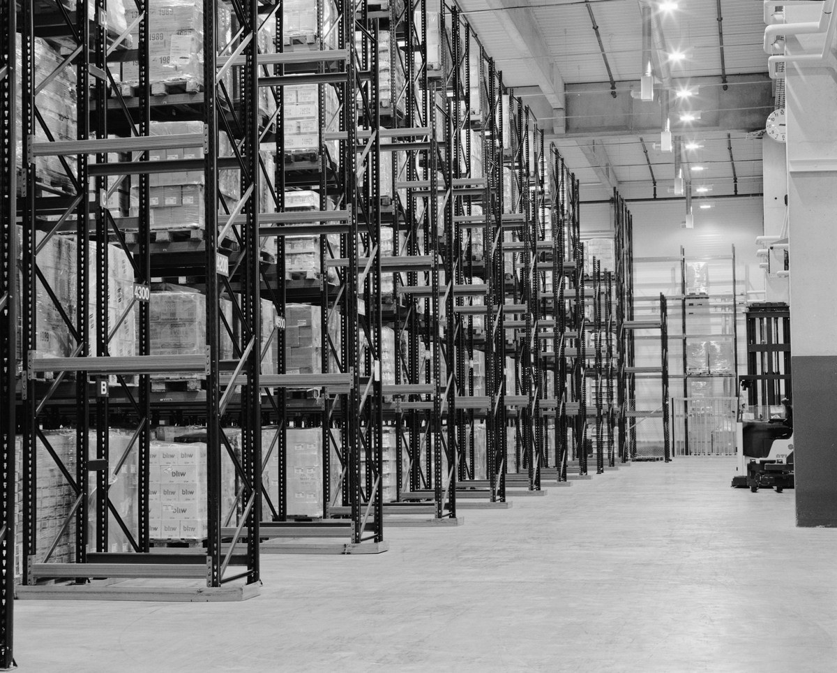 Cederoths varulager. Det är hit alla färdiglastade pallar ställs. Varje pall har en lapp som talar om när lasten är tillverkad.