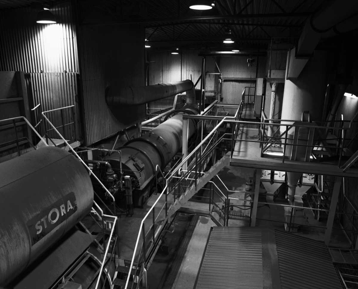 Bilden tagen från plattform vid vindsikt där man ser torkugnen, nedmatningen till brännugnen och förrådkärlet för natronlut.