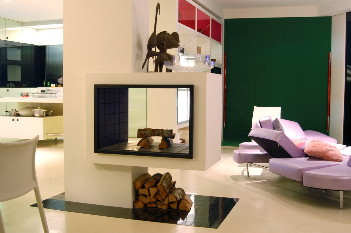 Tänk om. En utställning på Telemuseet om hur det skulle kunna se ut i framtiden i våra hem. I utställningen ingår en film em en familj som skulle kunna tänkas bo i detta hem. Det är ett kök, vardagsrum, sovrum, badrum, uterum och hall. Möbler och teknik som rummen är utrustade med är utvecklat och designat utifrån ett tänkbart framtidssenario. Detta är vardagsrummet med sin öppnaspis och soffan i bakgrunden.