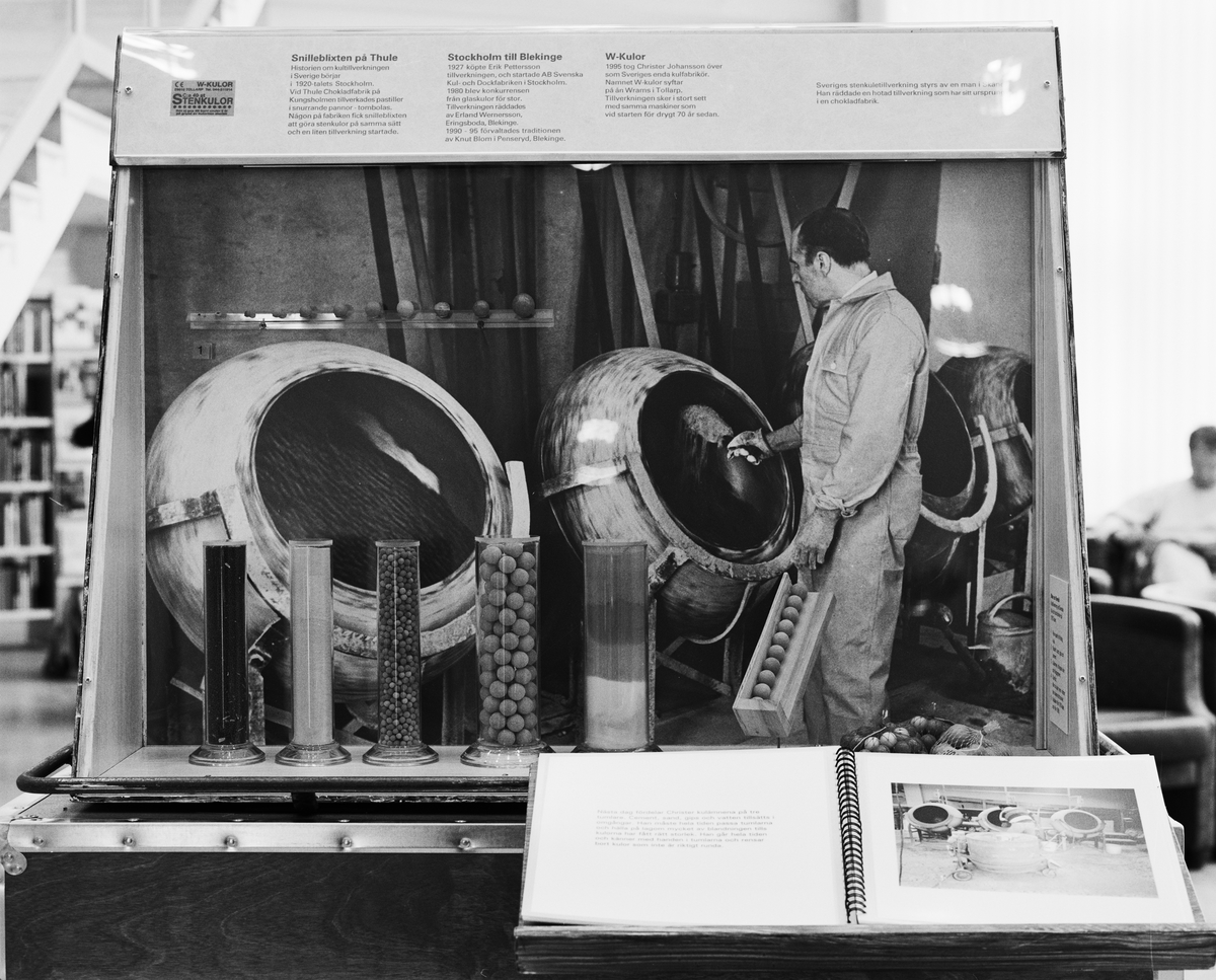 Dokumentation av den lilla utställningen av "Kulor, Krus och Kaviar". Sätts upp på Västerås stadsbibliotek. Vandringsutställning. Samarbete mellan Tekniska museet och Riksutställningar. Stenkule-monter.