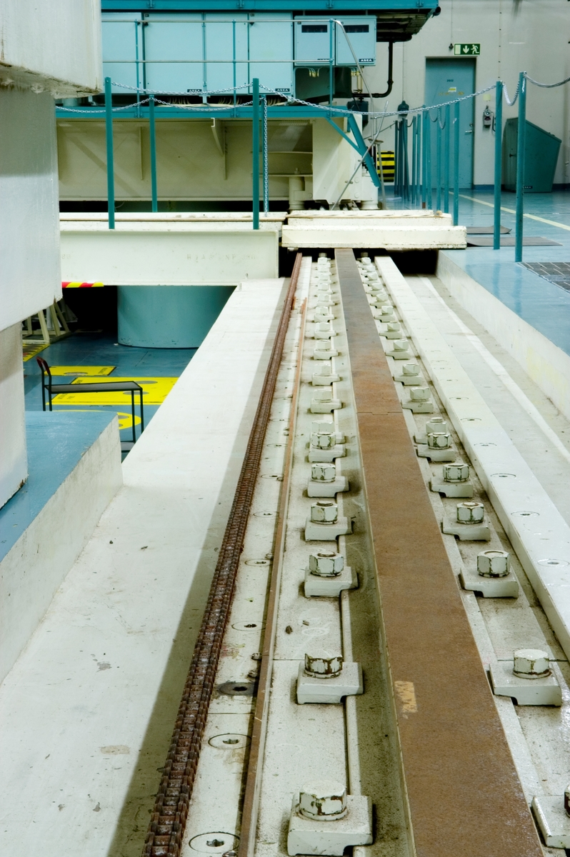 Bilden föreställer: Plan 26 RB rum nr. 2606. Reaktorhallen mot södra väggen. Reaktorhallen med räls för laddmaskin. På vänster sida om rälsen finns en kedja för laddmaskinens positionsbestämmning. Förklaring av system framgår av rapport :Statens Vattenfallsverk A23/60 5/4 1960.