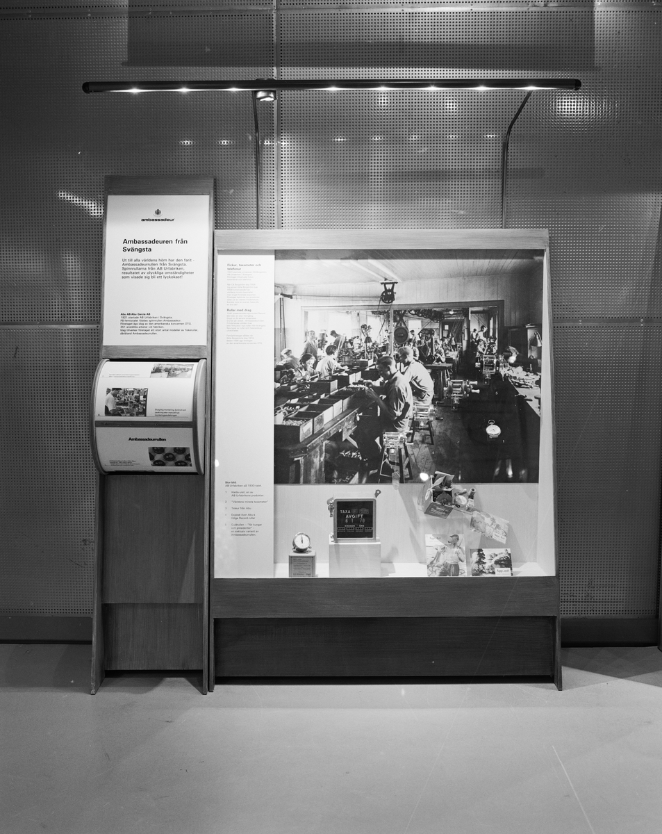 Dokumentation av utställningen "Kulor, Krus och Kaviar", Wallenberghallen. Monter med bild på "Ambasdörrullen", spinnspörulle. Snurra med produktionsprocessen.