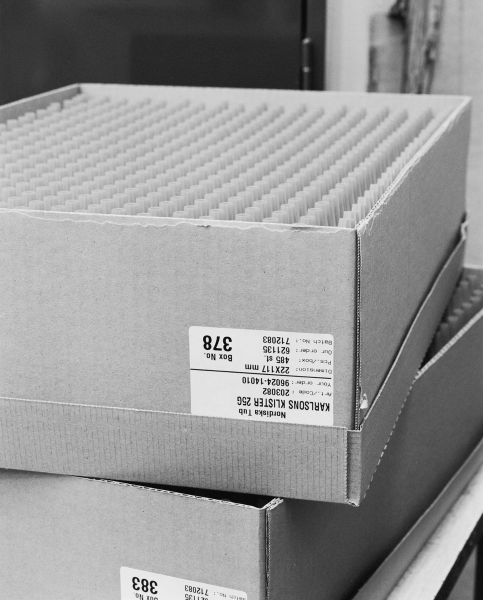 Tomma tuber i en ny kartong vänder man upp och ned för att se om det finns kork på alla. Varje kartong har två lock, för att kunna ladda magasinet med tuber.