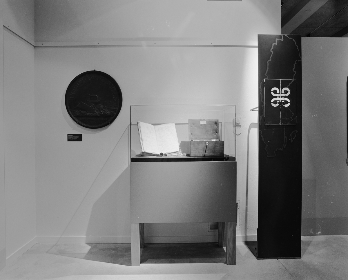 Dokumentation av Ferrum. Jernkontorets förtjänstmedalj och monter med reseschatull och Mästerskap & vetenskap.