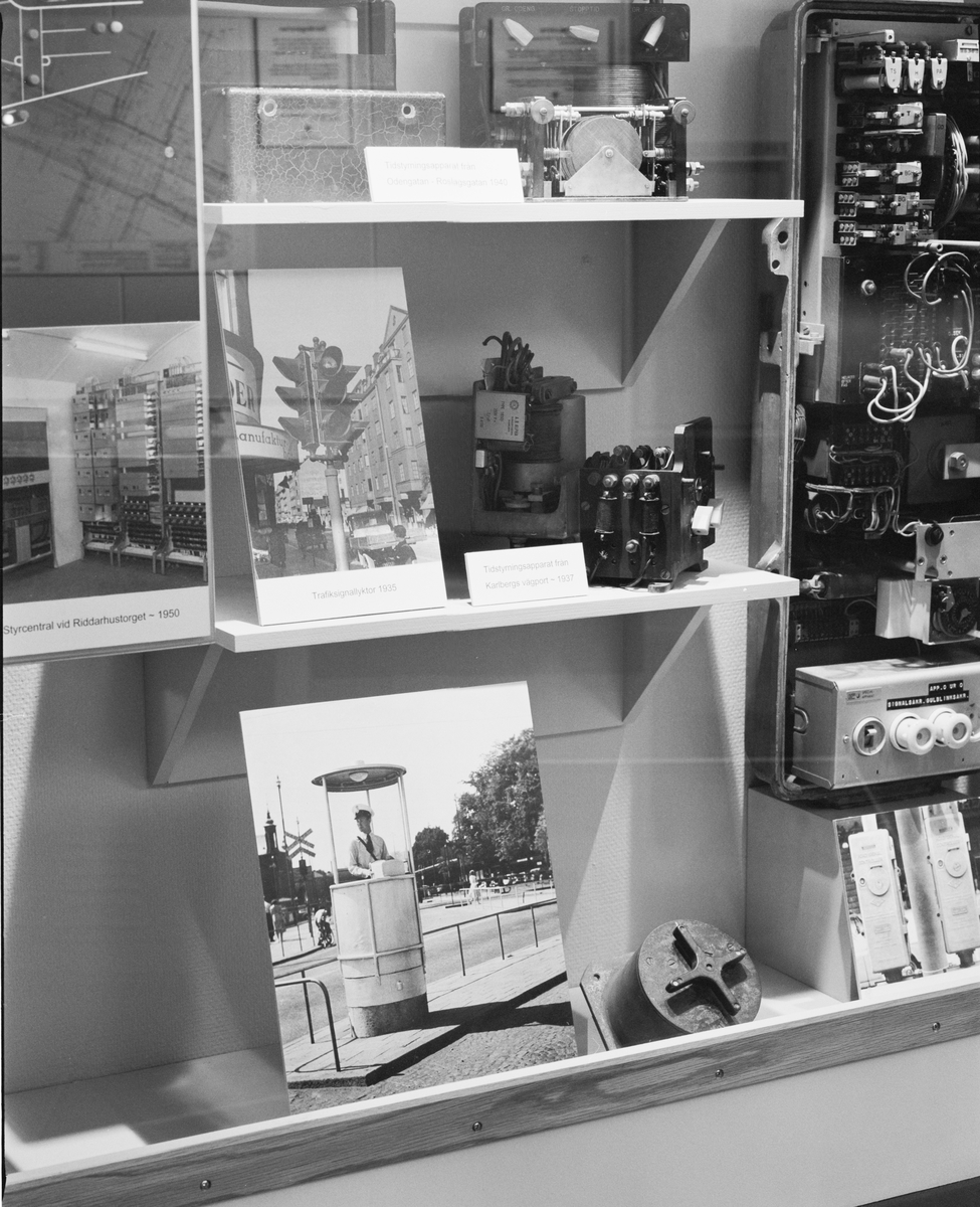 Dokumentation av utställningen "Tunnelbanetorget", Elkraftsmuseet. Monter med den historiska apparattekniken. Apparater för att sköta trafikljusen.