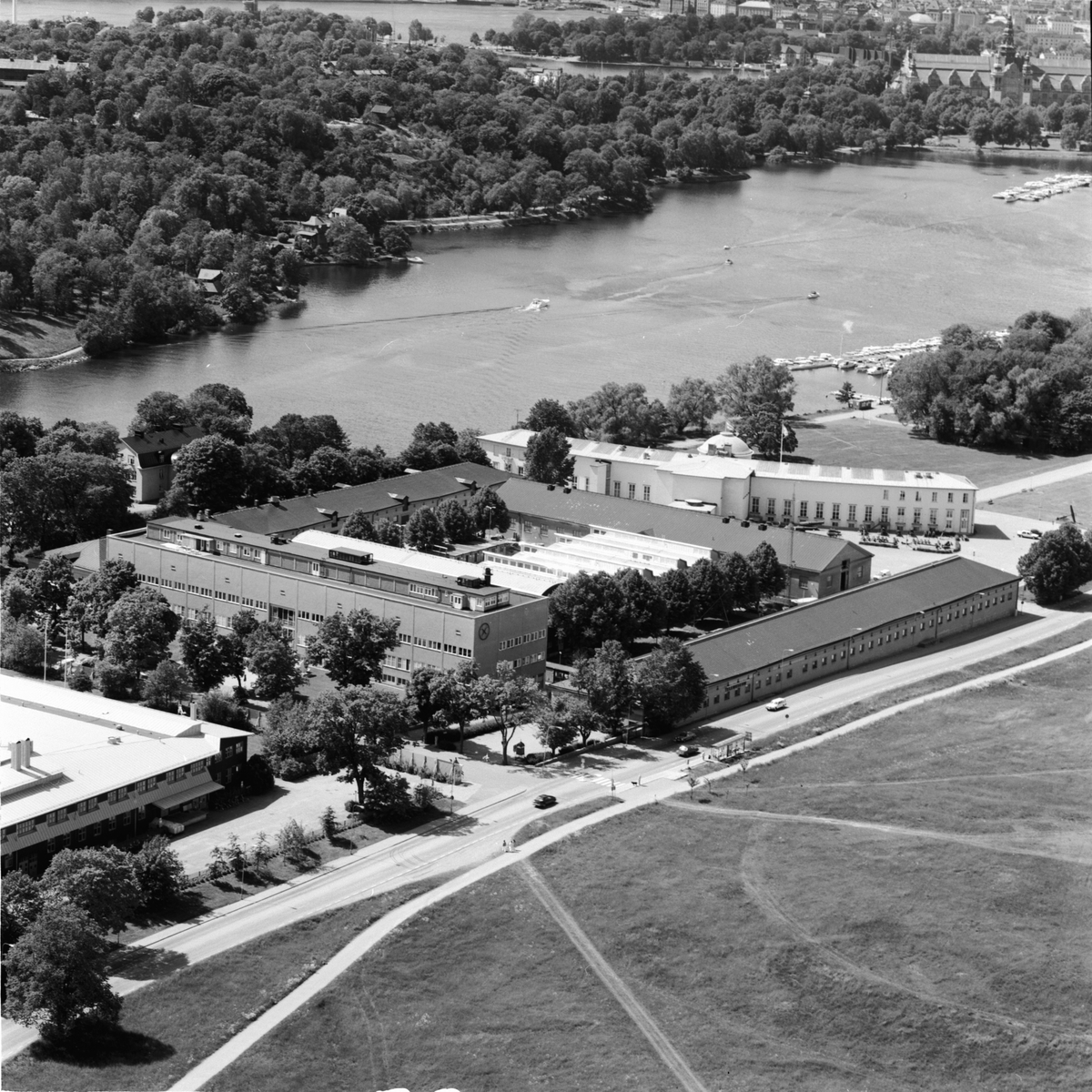 Vy från Kaknästornet över Tekniska Museet och Telemuseum. I bakgrunden syns Statens Sjöhistoriska museum.