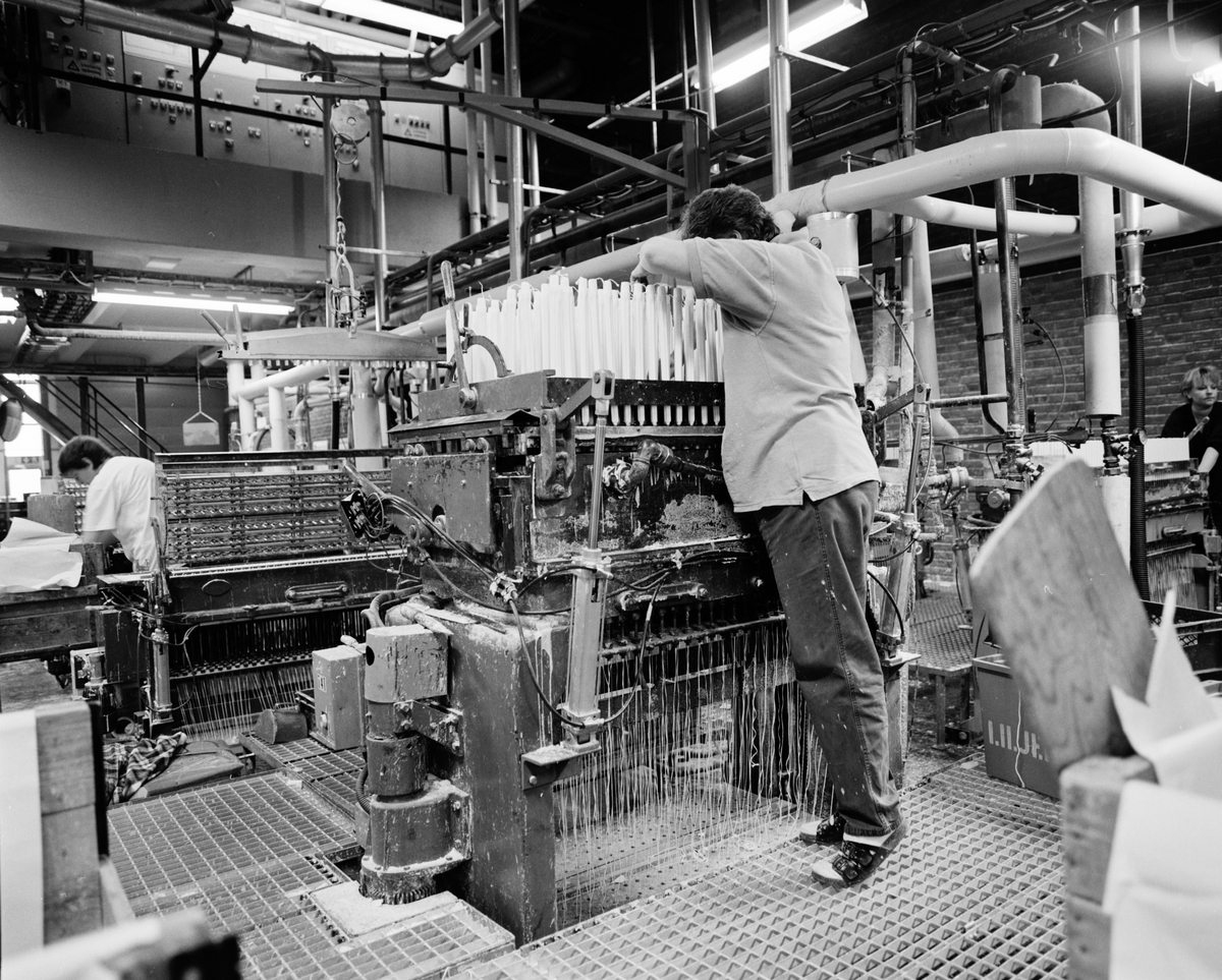 Gothic ljusstöpningsmaskinen (före 1970). Britt Marie Jansson, gruppledare och operatör, "Bibban" rättar till ljusen i uppfångaren och drar upp vekar som gått av.