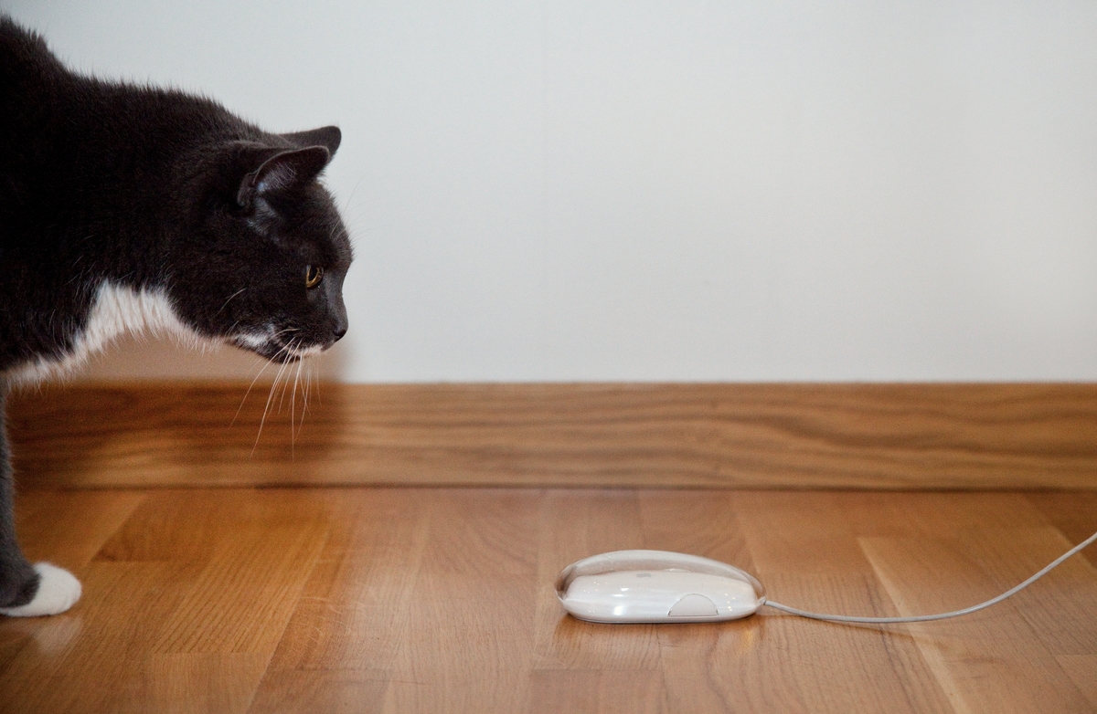 Katten Hugo jagar en Apple datormus.