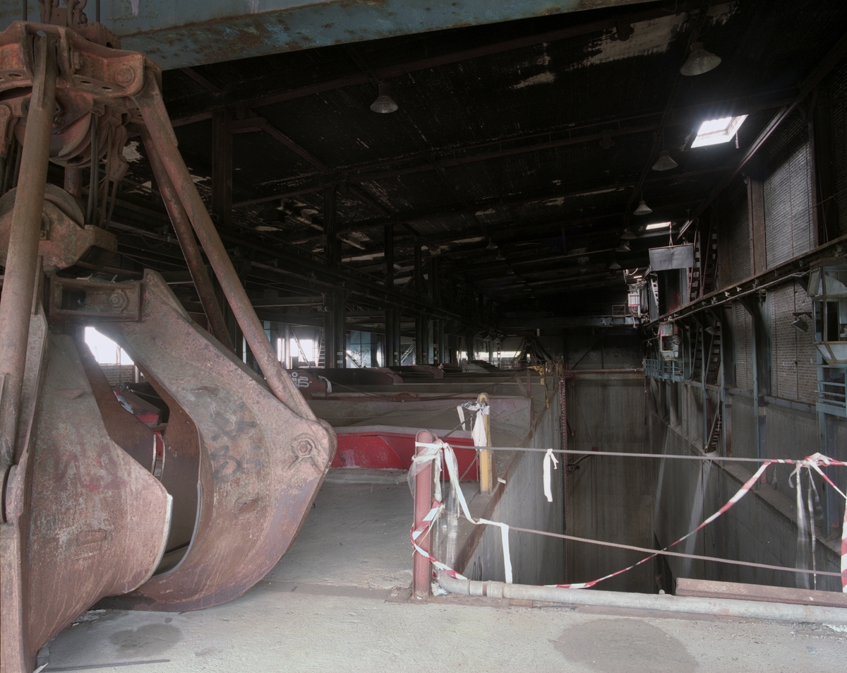 Bildtext: Bunkern i Lövsta sopförbränningsanläggning 2004. Till vänster syns en av två skopor med vilka man matade de fem ugnarna med sopor.