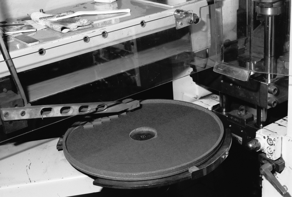 PRESSNING . Detaljbild av grafittallrik där robotarm mönsterlägger pressade ämnen. >>