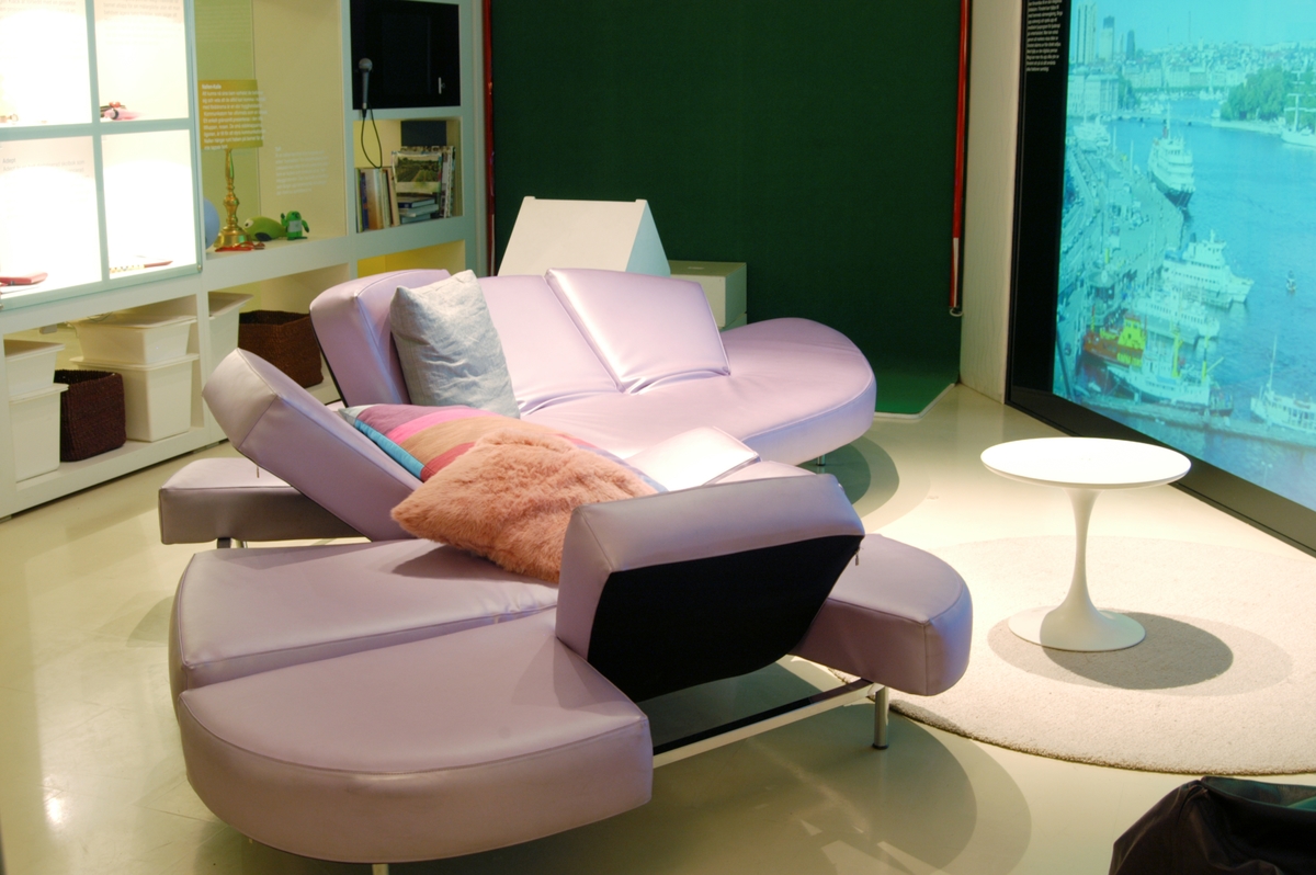 Tänk om. En utställning på Telemuseet om hur det skulle kunna se ut i framtiden i våra hem. I utställningen ingår en film em en familj som skulle kunna tänkas bo i detta hem. Det är ett kök, vardagsrum, sovrum, badrum, uterum och hall. Möbler och teknik som rummen är utrustade med är utvecklat och designat utifrån ett tänkbart framtidssenario. Detta är vardagsrummet med ett fönster som även är bildskärm och en special designad soffa.