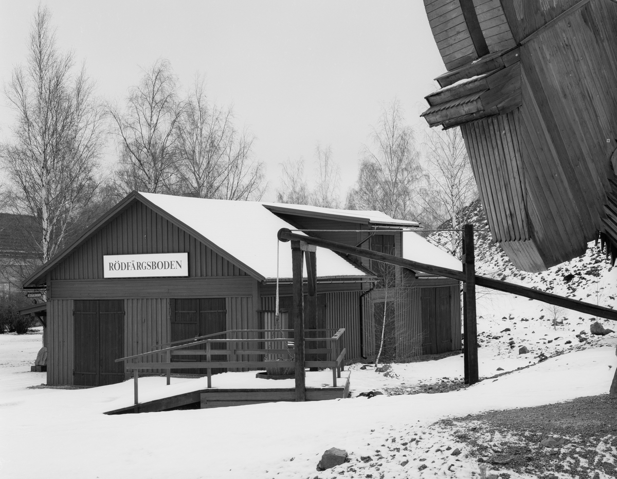 Rödfärgboden. På sommaren försäljning av turistprylar och café verksamhet. I förgrunden syns Kårebocken, som enligt sägen hittade fyndigheter vid Falu Koppargruva.. Rödfärgsboden är den gamla "vasken" d.v.s. här sorterades malmen för hand. Kurant malm skiljer sig från icke kurant.. Denna anläggning var i drift fram till anrikningsverket byggdes 1927.