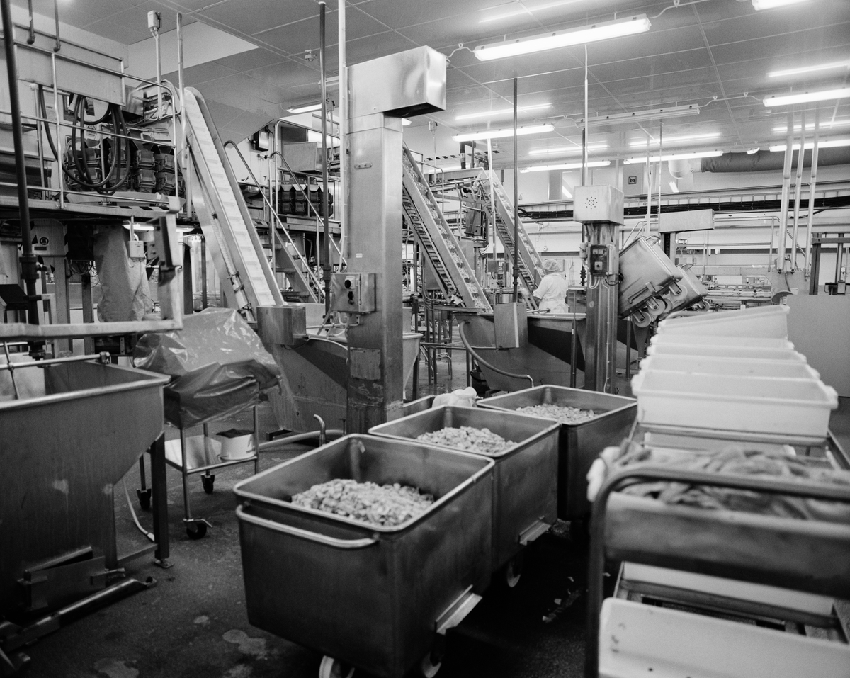 Här står sillvagnarna på kö framför invägningsvågarna på linjen för sill i glas. Sillbitarna kommer från olika beredningsfabriker, främst från Norge och Island. Vågarna som syns uppe t. v. i bild, är datastyrda och gör "grovjobbet" med att väga och fylla glasen och har på ett markant, poitivt sätt minskat antalet arbetsskador hos personalen.