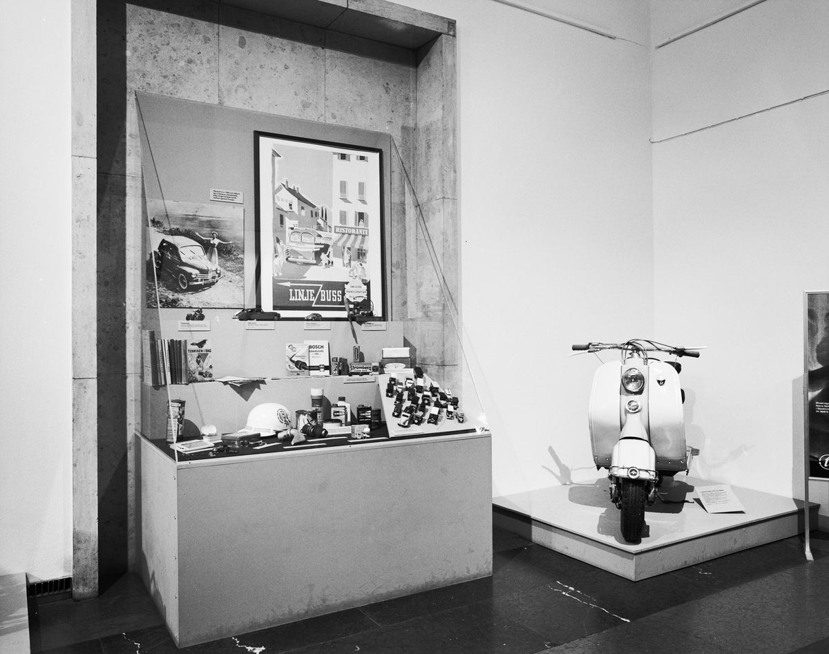 Dokumentation av "Automobilhistoriska klubben" utställningen, Sverige- salen. Lambretta 125 id?, 1954 och monter diverse tillbehör från 50-talet.