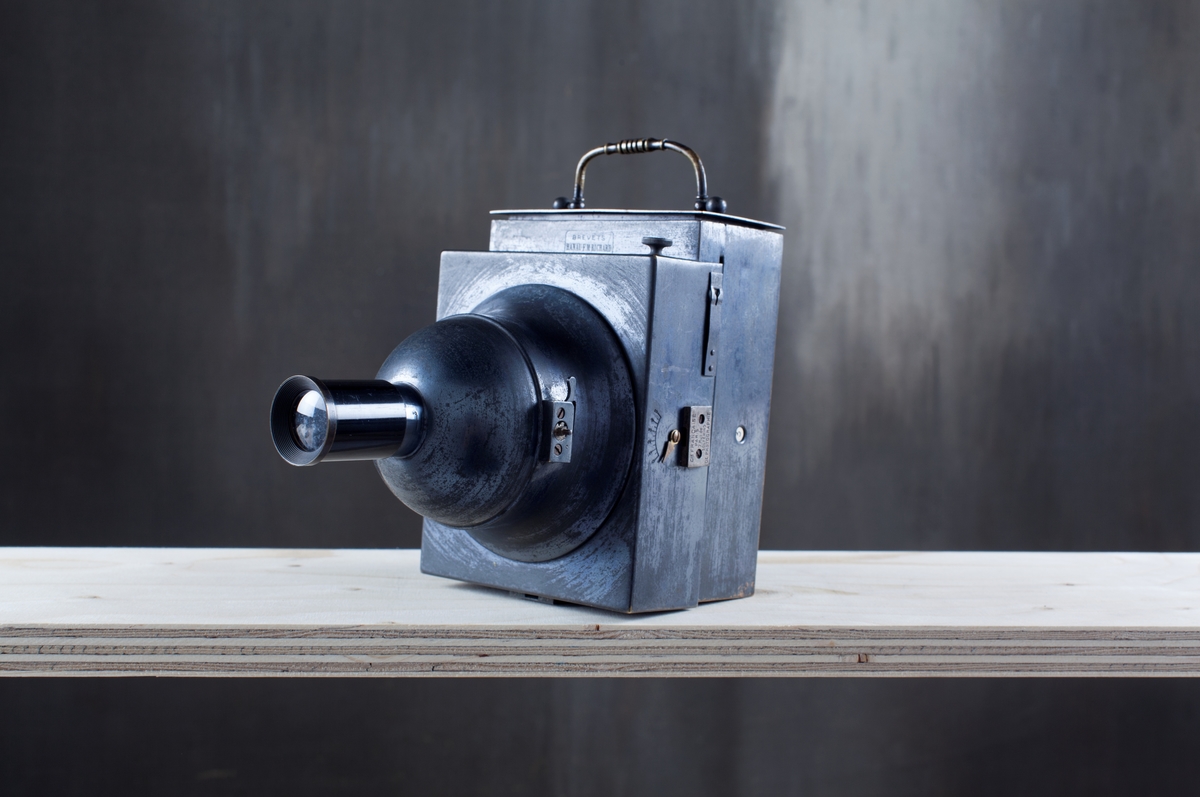Lådkamera av metall, för plåtar 9 x 12 cm, med halvsfärisk slutare och utvändig växling. Tillverkad helt i metall - oxiderad silverpläterad mässing. Plåtväxling med skjutlåda i kassetten.