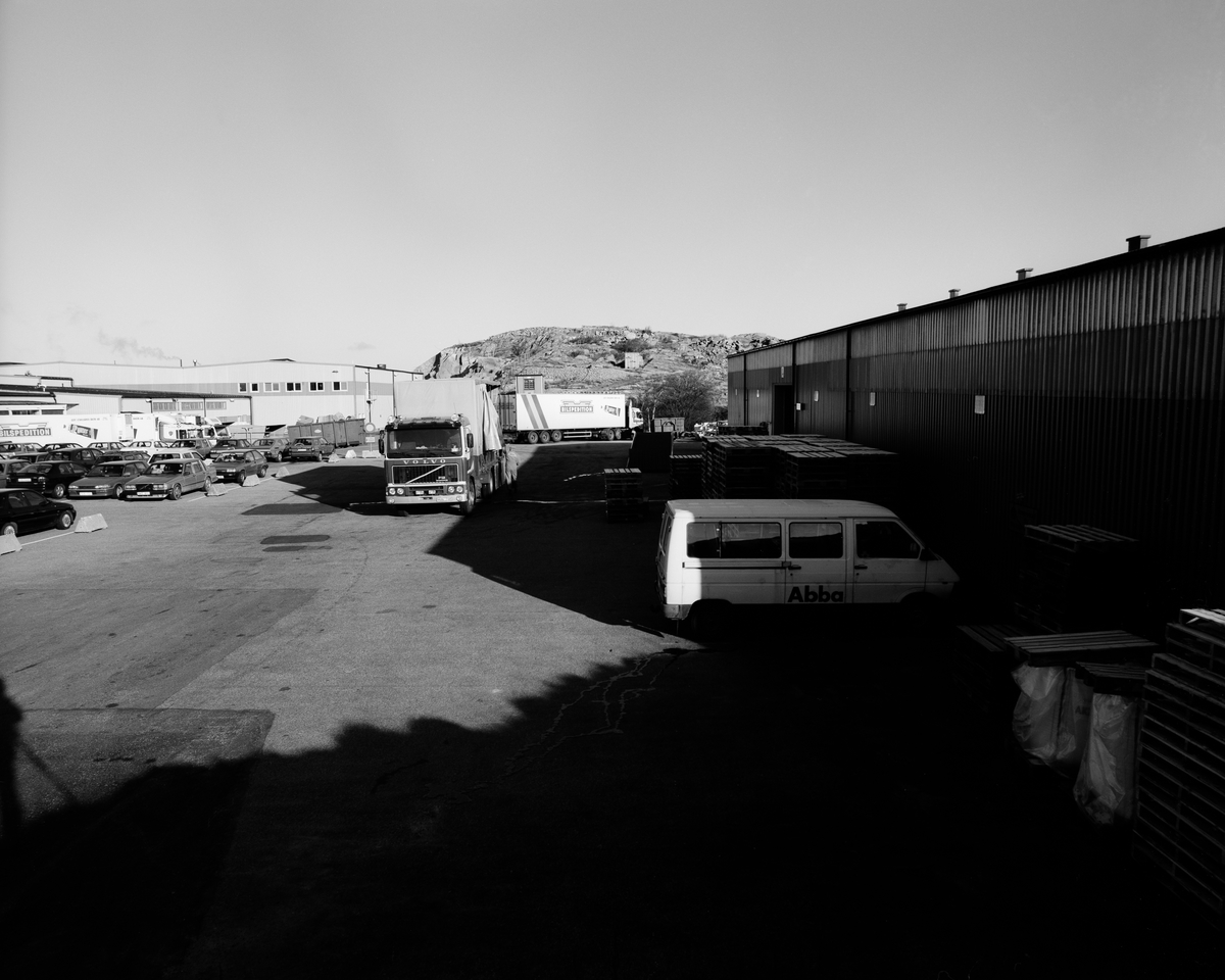 Bilden är tagen från tillfartsvägen i bergsskärningen. T.h. syns lagerhall "Llentab A" och t.v. fabriken. Bussen utanför Lientab A användes för transport av personal boenden i Uddevalla. Den kördes oftast av Einar Arvidsson eller Leif Andersson. Lastbilen rakt fram är en av de många som lastar eller lossar vid Utlastning Öster.