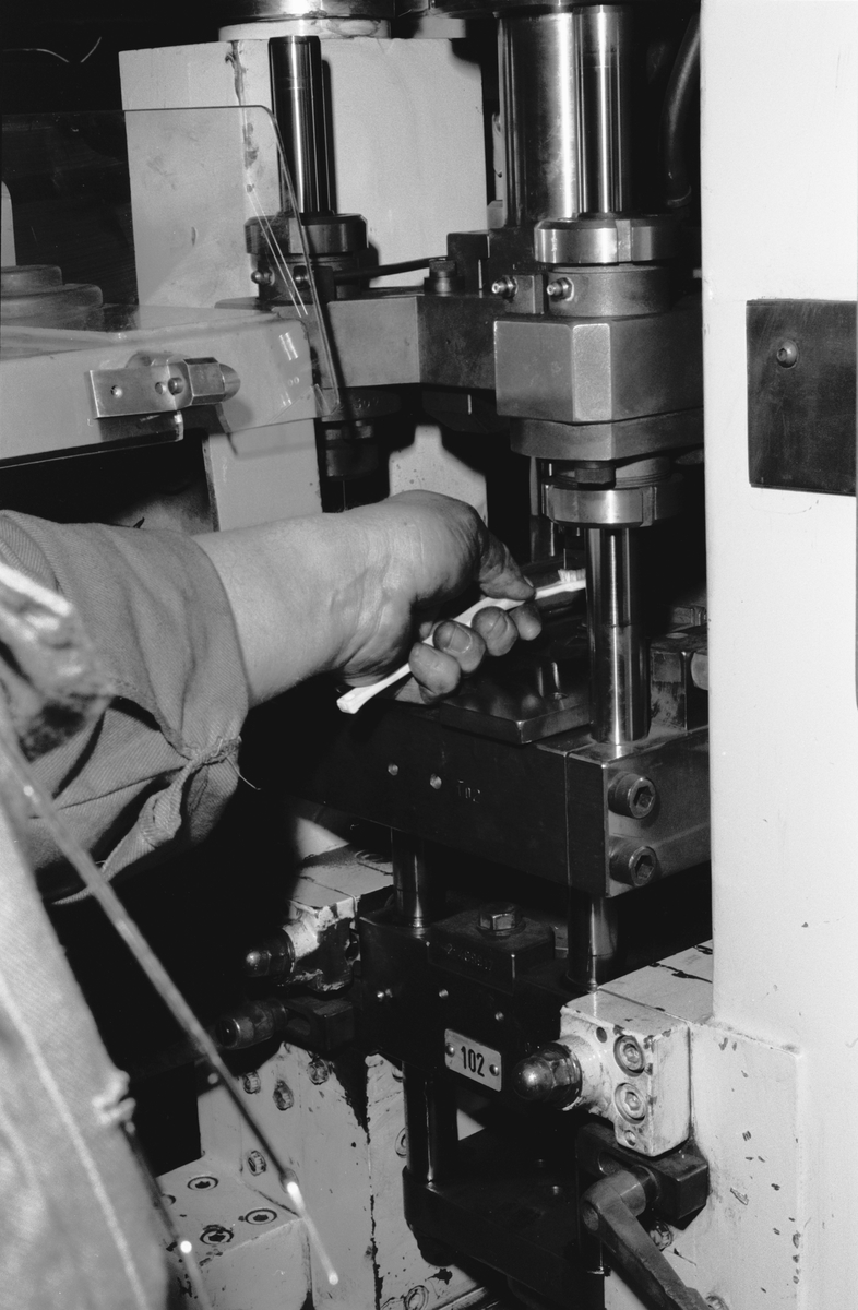 PRESSNING. Med pressen i putsläge borstar operatören bort eventuellt fastkletat pulver från stämpelns ändyta. >>